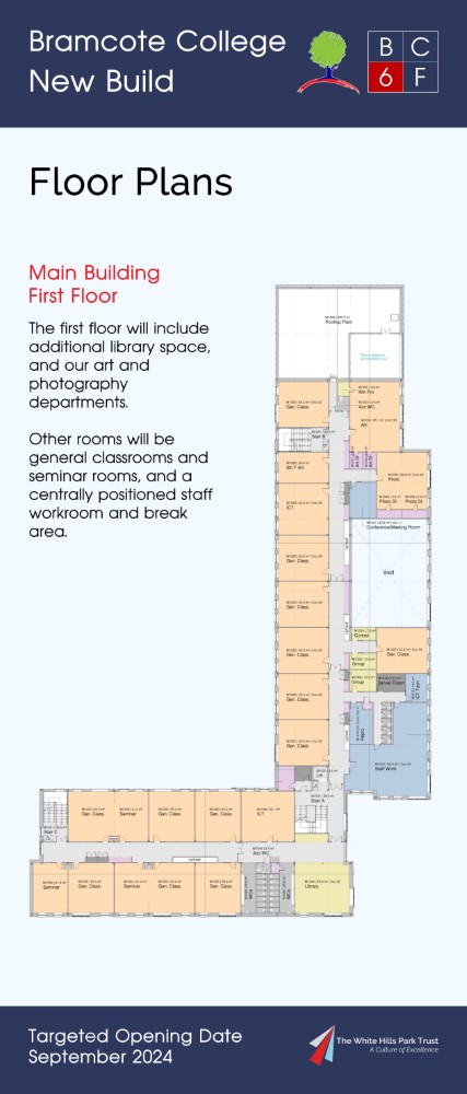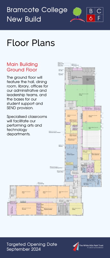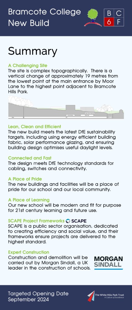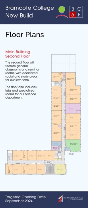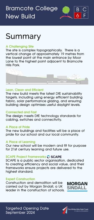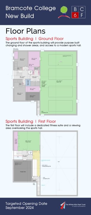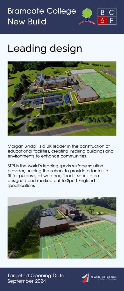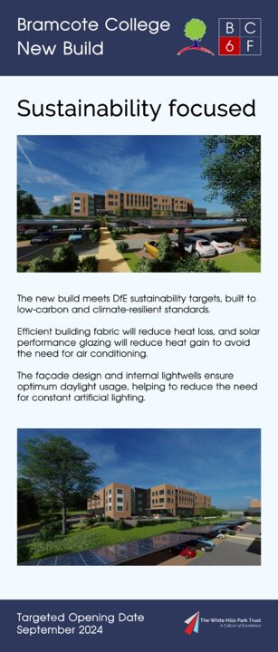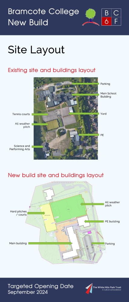 On 15th July 2022 Bramcote College welcomed the public to its Summer Festival, and within the marketing for this, sent to all parents at Bramcote College and posted on social media, was an invitation to view an exhibition of the new build plans. Photographs of the setup, including the looping presentation video used and copies of roll-up banners can be found below. The content was published the same day on Bramcote College's website at https://bramcote.college/newbuild